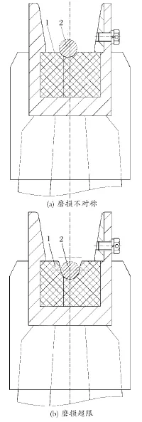 天輪裝置在返廠修復(fù)時(shí),天輪襯墊磨損一般出現(xiàn)2 種情況 (見圖 9),襯墊磨損左右不對(duì)稱和襯墊深度方向磨損超限。分析其原因:襯墊左右磨損不對(duì)稱是因?yàn)樘燧喲b置與主軸裝置不對(duì)中所致;襯墊磨損嚴(yán)重直接原因是鋼絲繩與襯墊發(fā)生了相對(duì)運(yùn)動(dòng),鋼絲繩打滑,輪緣偏擺較大也是原因之一。