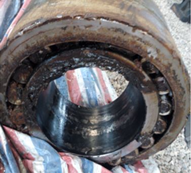 返廠修復(fù)的天輪裝置軸承座打開后,發(fā)現(xiàn)內(nèi)部多為脂水混合物,軸承內(nèi)部銹蝕嚴(yán)重,如圖8所示。在正確使用、維護(hù)及時(shí)的情況下,軸承不應(yīng)出現(xiàn)這種問題,其原因是:軸承座端蓋密封年久老化,在露天雨水的沖擊下,雨水從失效的密封處進(jìn)入軸承座內(nèi)部,使得軸承潤(rùn)滑不良,在重載條件下造成軸承磨損銹蝕。