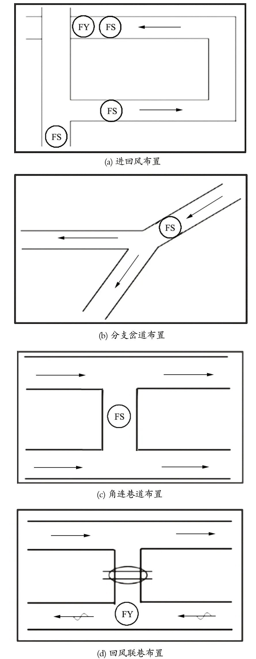 針對井下各地點(diǎn)作業(yè)內(nèi)容與通風(fēng)不同方式,尤其是在繞道車場、分支岔路巷道和聯(lián)絡(luò)巷等地點(diǎn),需要安裝傳感器進(jìn)行監(jiān)測。此外,在 Y 形和 U 形通風(fēng)方式的采煤工作面回風(fēng)流側(cè)也容易出現(xiàn)風(fēng)流不穩(wěn)定現(xiàn)象;在主要運(yùn)輸大巷、掘進(jìn)工作面設(shè)置有調(diào)節(jié)風(fēng)窗的風(fēng)門前后,由于運(yùn)輸需要經(jīng)常開啟風(fēng)門,容易導(dǎo)致風(fēng)流擾動影響較大,產(chǎn)生局部風(fēng)速、風(fēng)壓變化。這些地點(diǎn)均需要安裝傳感器加強(qiáng)監(jiān)測。
