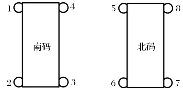 東西兩碼罐籠各有 4 根、共 8 根鋼絲繩罐道,罐道繩的分布如圖5 所示,圖中 1~8 號為罐道繩,下同。測試結(jié)果如表2 所列。