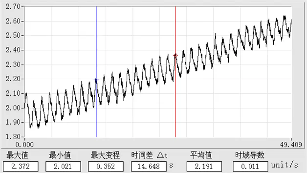提升機(jī)的運(yùn)行由電控系統(tǒng)控制,使用智能測試儀采集提升機(jī)配重上提時的速度曲線和電動機(jī)電流曲線,如圖 3、4 所示。為了分析提升機(jī)zui大速度運(yùn)行時提升速度和電動機(jī)電流的細(xì)節(jié)變化,通過處理得到局部放大圖,如圖 5、6 所示。