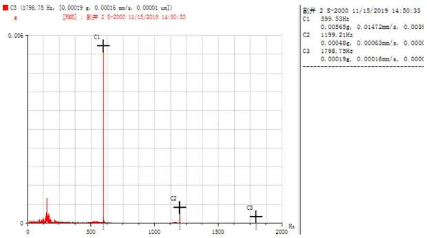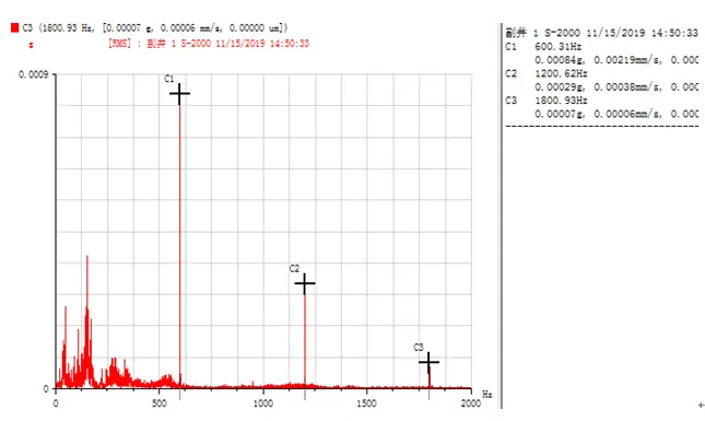 由圖 7、8 可知,振動的主頻率中沒有軸承故障特征頻率,表明軸承運(yùn)行狀態(tài)良好,未出現(xiàn)故障。但是在水平和垂直方向的頻譜圖中,都發(fā)現(xiàn) 600 Hz 頻率及其倍頻成分,且該頻率成分的幅值zui高,其對應(yīng)的是 2 倍的 SCR (全波整流可控硅故障特征頻率)。在頻譜圖中出現(xiàn)此頻率,說明電控系統(tǒng)出現(xiàn)故障,導(dǎo)致提升機(jī)運(yùn)行速度不穩(wěn),與前面測試的速度圖可以相互印證。