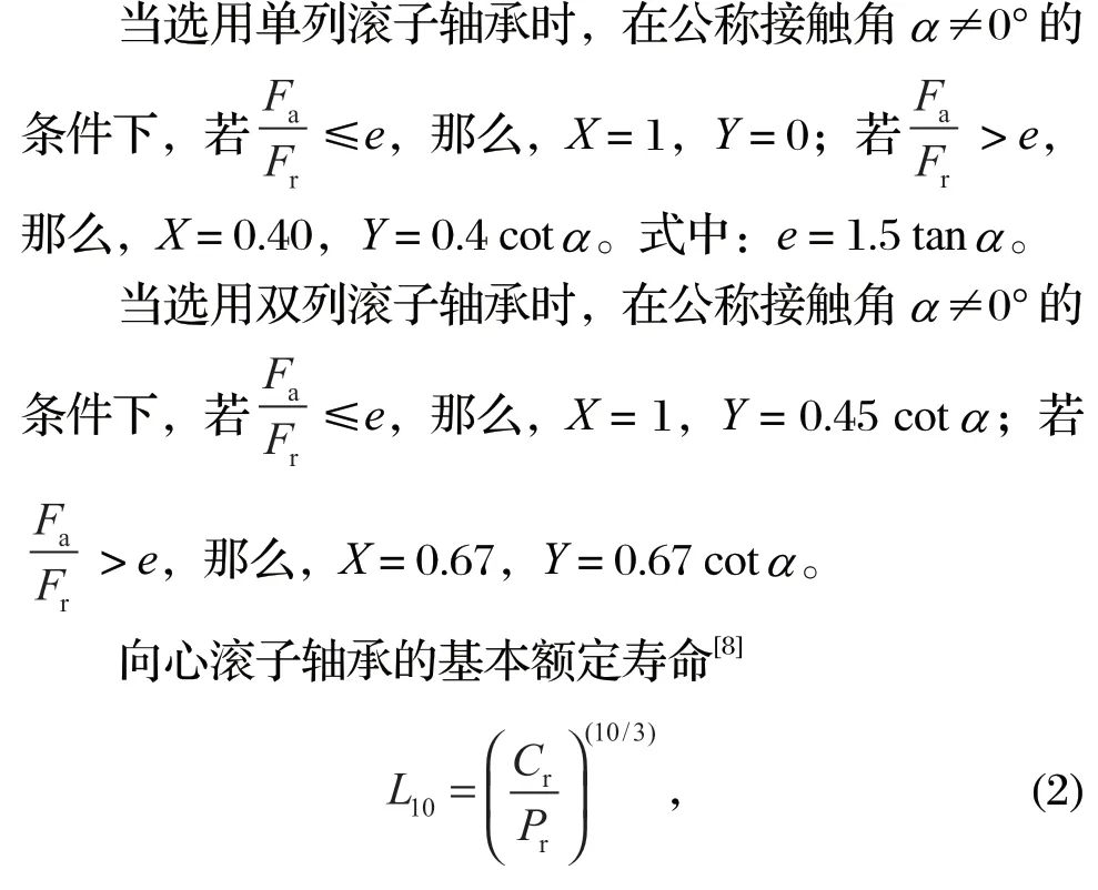式中:Pr 為聯合載荷下軸承徑向當量動載荷,N;Fr為軸承徑向動載荷,N;Fa 為軸承軸向動載荷,N。