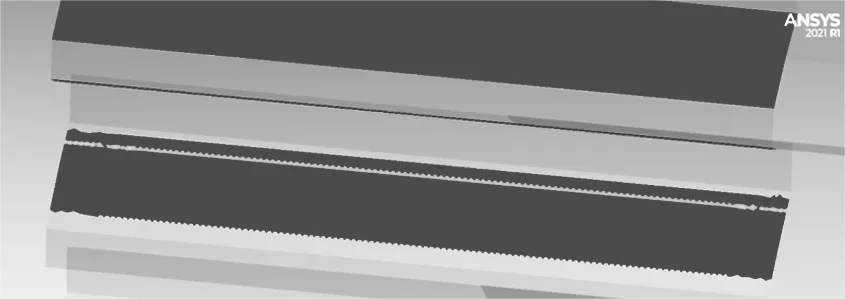 在 SolidWorks 中對同步齒輪進行建模并調整,確保同步齒輪不會出現干涉。為了提高仿真精度和數據的可靠性,對靜強度仿真過程中參與嚙合的幾對輪齒表面網格化。齒面網格細化模型如圖5所示。