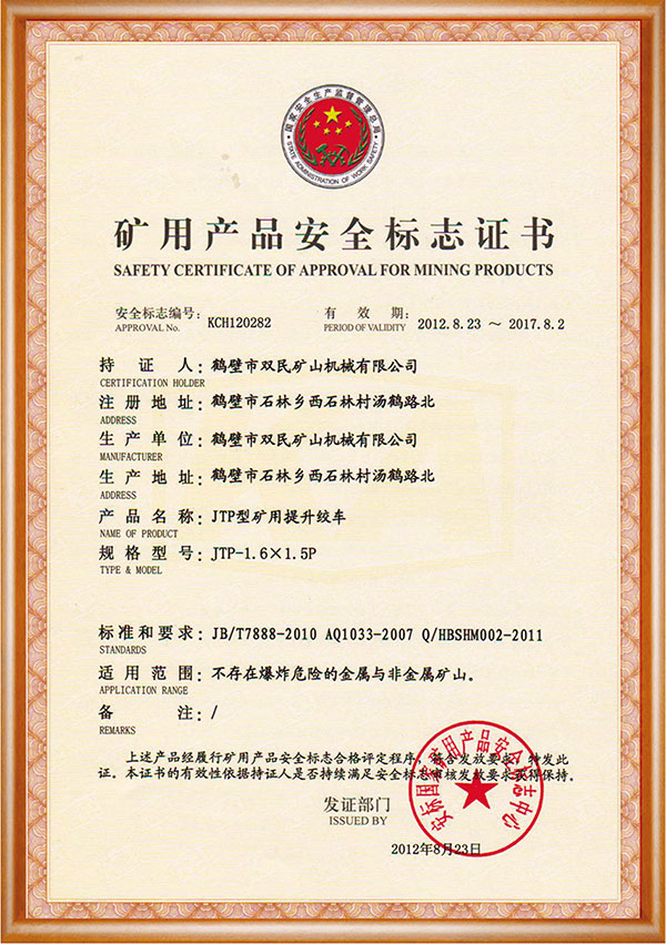礦用產品安全標志證書